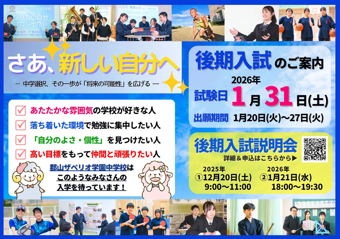 郡山ザベリオ学園 感謝 おかげさまで、本学園は2023年に創立90周年を迎えました。 EACH PERSONSHINES 一人ひとりが輝きつづける学校を目指して ザベリオ学園からのお知らせ 2025/05/02 【お知らせ】卒業アルバムに係る情報漏洩の可能性について WHAT'S NEW 幼稚園からのお知らせ ♡感謝祭♡ 2025/11/21 一覧へ 小学校からのお知らせ 【5年生】クリスマス練習 2025/11/20 一覧へ 中学校からのお知らせ 【受験をご検討のみなさまへ】後期入試(1月31日)のご案内 2025/11/22 一覧へ (参考)郡山市立学校新型コロナウィルス対策 対応マニュアル(第3版) 清く、明るく、強く VISION 郡山ザベリオ学園の教育 世界への関心を広げ、 生かされている現実に感謝できる 人材の育成 READ MORE ABOUT 郡山ザベリオ学園について READ MORE FLOW 一貫教育について READ MORE KINDERGARTEN 幼稚園 ELEMENTARY SCHOOL 小学校 JUNIOR HIGH SCHOOL 中学校 ザベリオ会会報 決算書