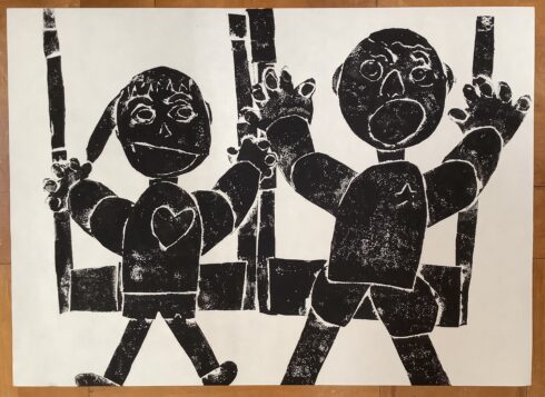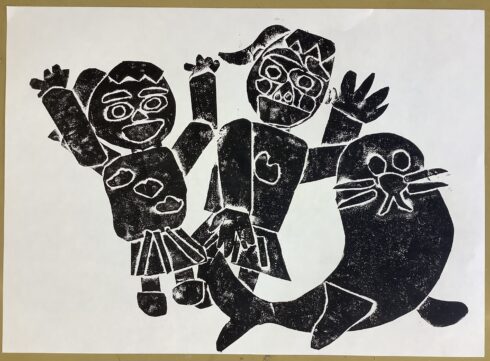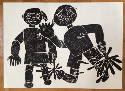 図工の学習で、今年も紙版画に挑戦しました。1年生の時は自分の姿を表現しましたが、2年生では自分ともう一人の2人を表現しました。画用紙で版を作るのはとても難しいのですが、みんなよくがんばりました!そして刷る時には、みんなで協力しながら楽しく活動しました。