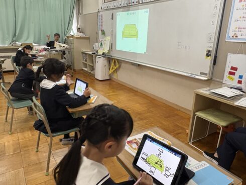Andy先生の英語の授業では、子どもたちは聞いた英語をもとに、タブレット(ロイロノート)上で部屋の模様替えに挑戦!
