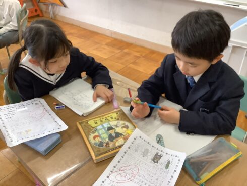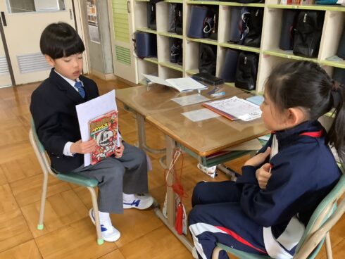 その練習を行いました。「どんなあらすじ?」「気に入った場面はどこ?」「どんなところが、面白かった?」など、詳しく伝えられるよう