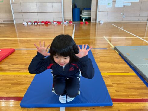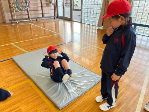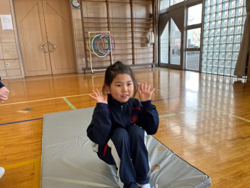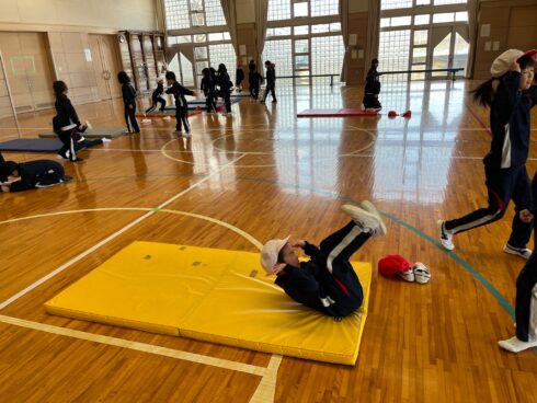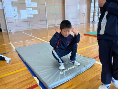 体育科岩谷先生直伝の「ミッキーだるま」で後転の練習をしています。両手を耳に、背中を丸めて、何度も繰り返して頑張っています。