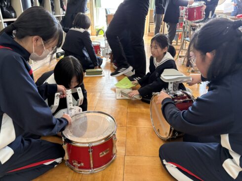 6年生は、自分たちが経験してきた「体験」の重みを言葉に変え、「ここはもっと胸を張って」「こうやると音が出やすいよ」と、5年生一人ひとりの目を見て丁寧にアドバイスを送ります。