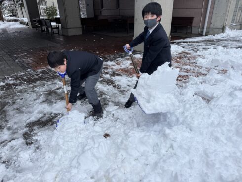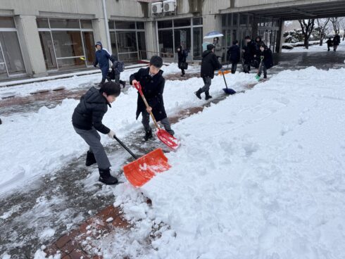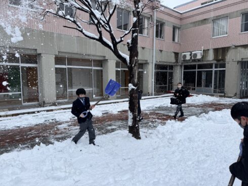 春の雪が降った朝、学校に登校すると雪かきをしている男子が何人もいました。これから登校するみんなのために足元をきれいに整備してくれていました。ありがとう!