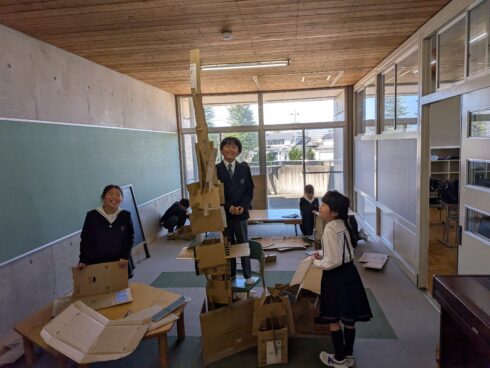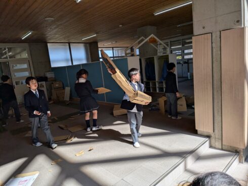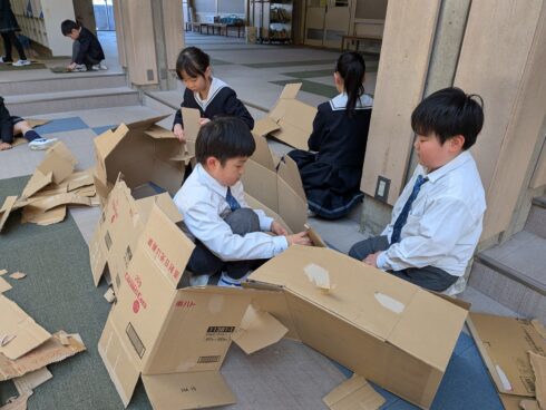 4月8日、3年生になって初めての図工「クミクミックス」に挑戦しました。接着剤を使わず、段ボールの切り込み同士を組み合わせて形を作る活動です。