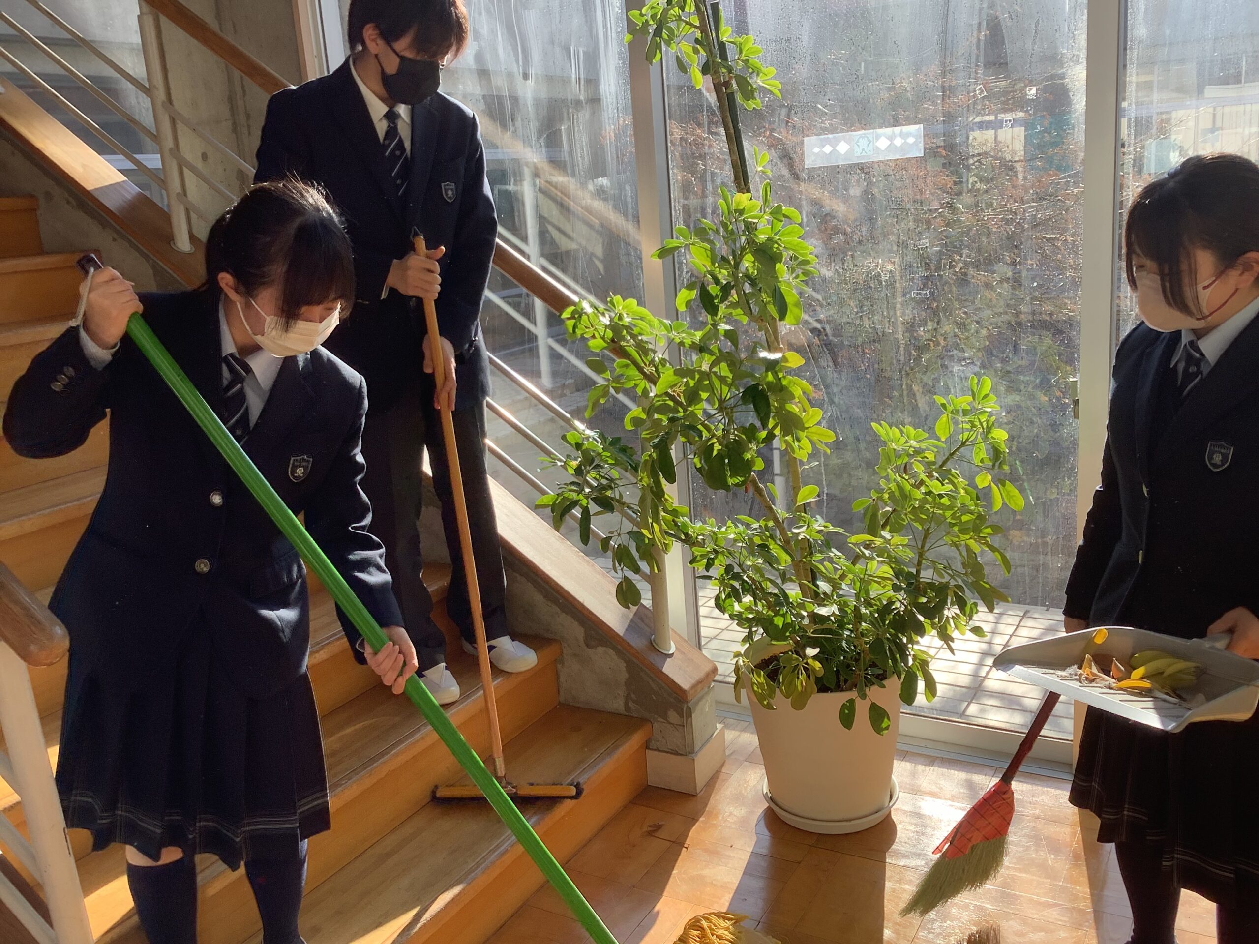 ここ数日は、感染症拡大防止の観点から学年フロアのみの清掃が続いていましたが、まもなく卒業を迎えるにあたり、これまで学んできた学び舎への感謝の気持ちを込めて、普段はなかなか手の届かない場所まで丁寧に掃除を行いました。
