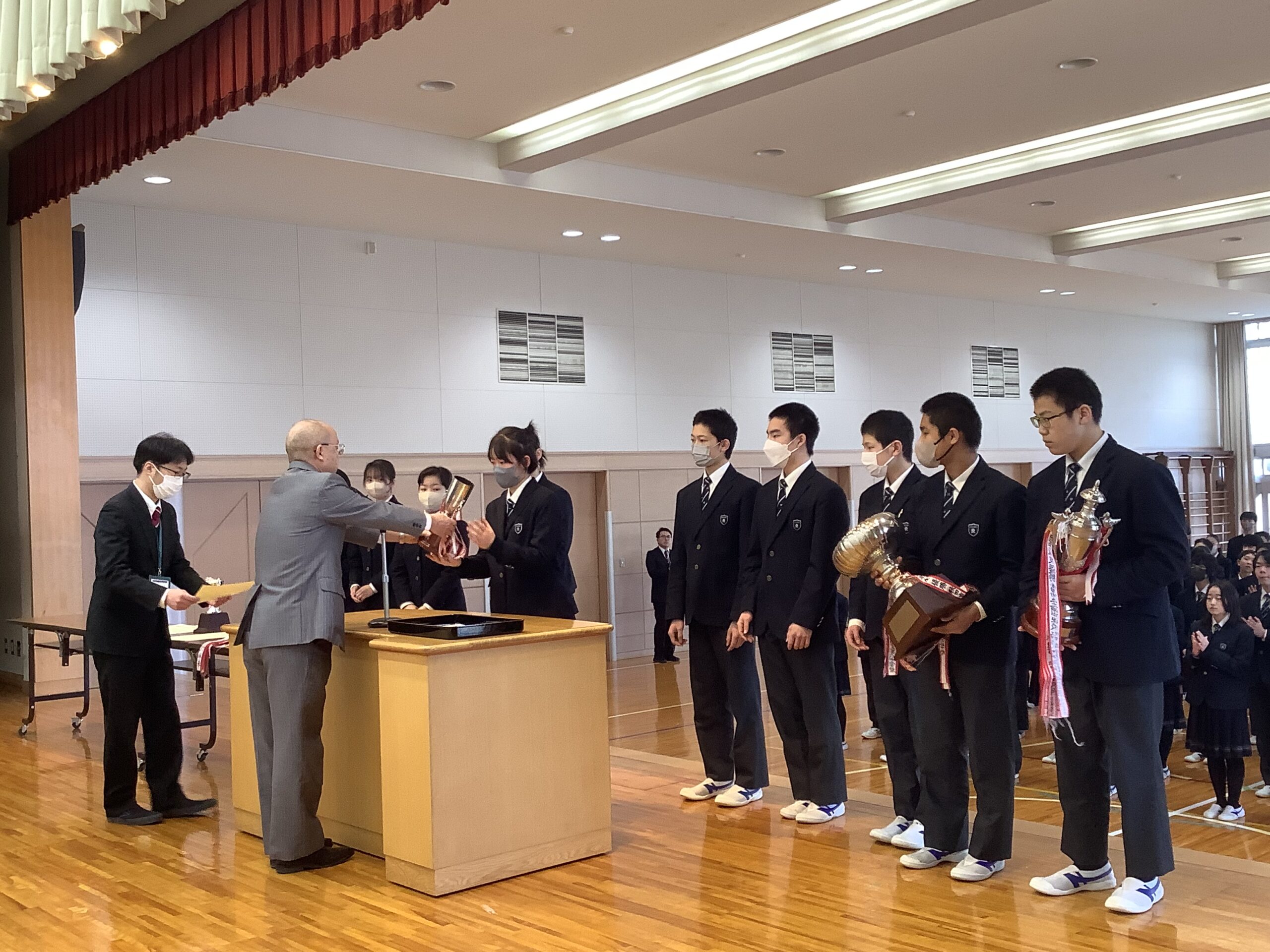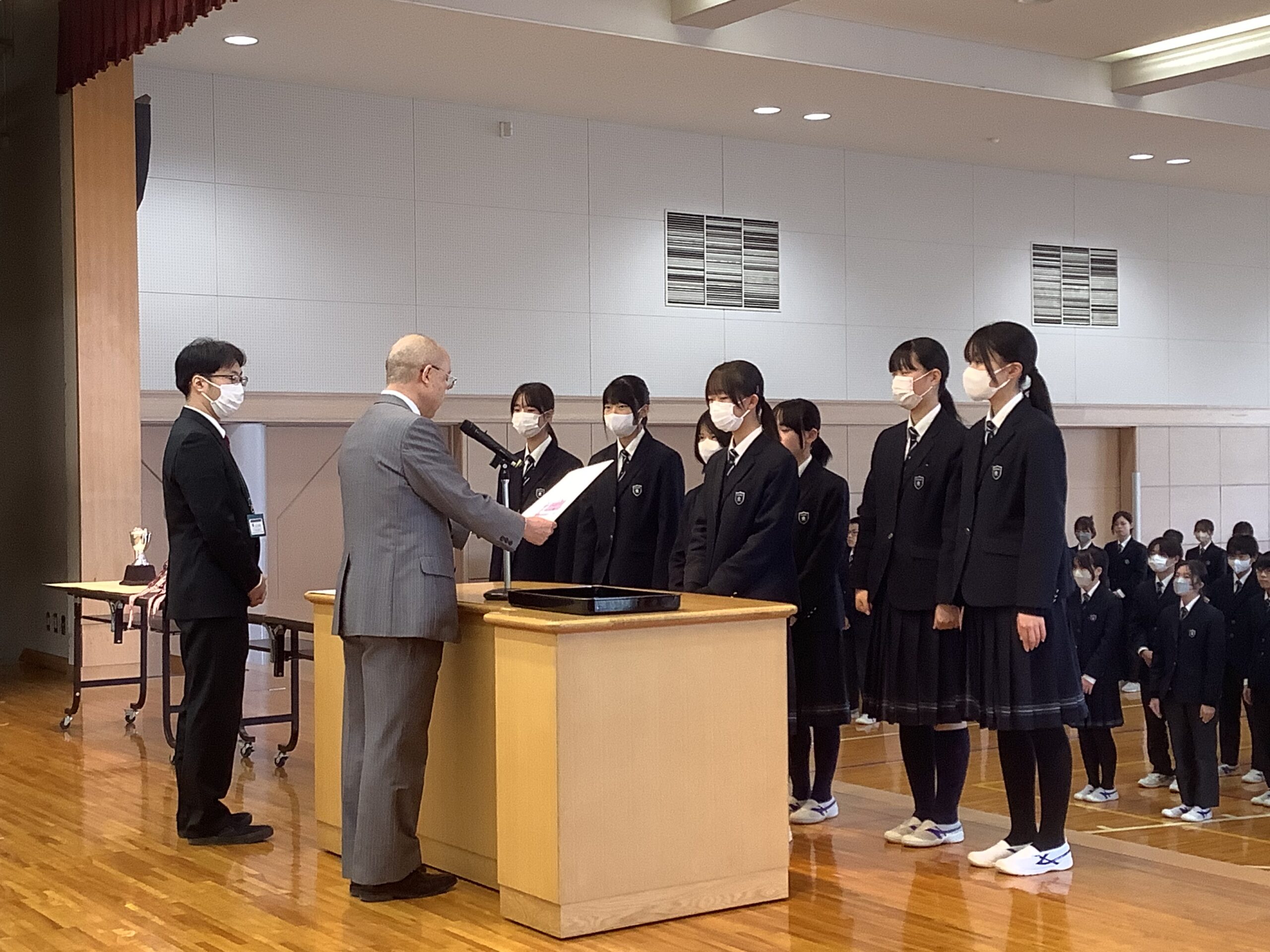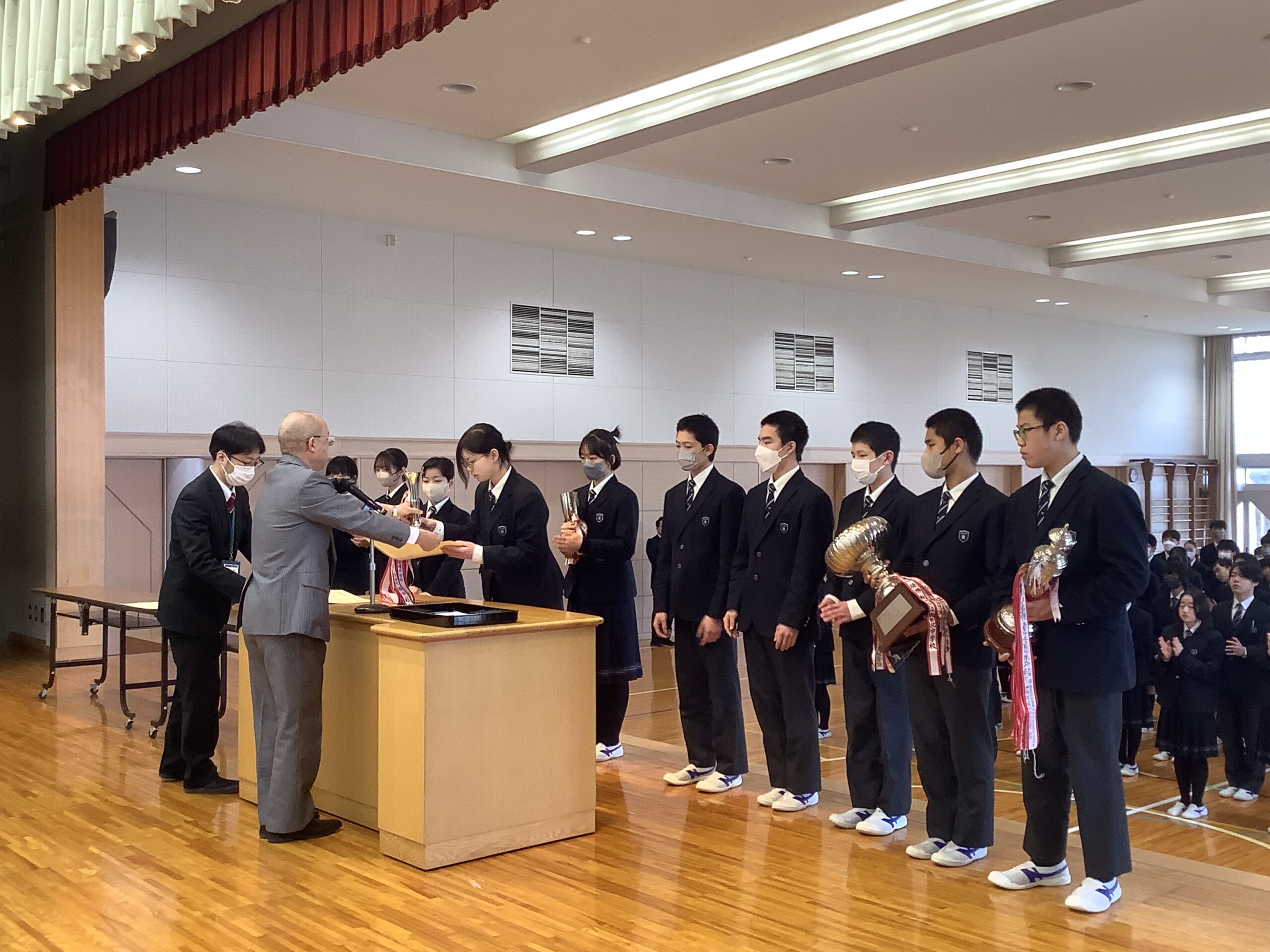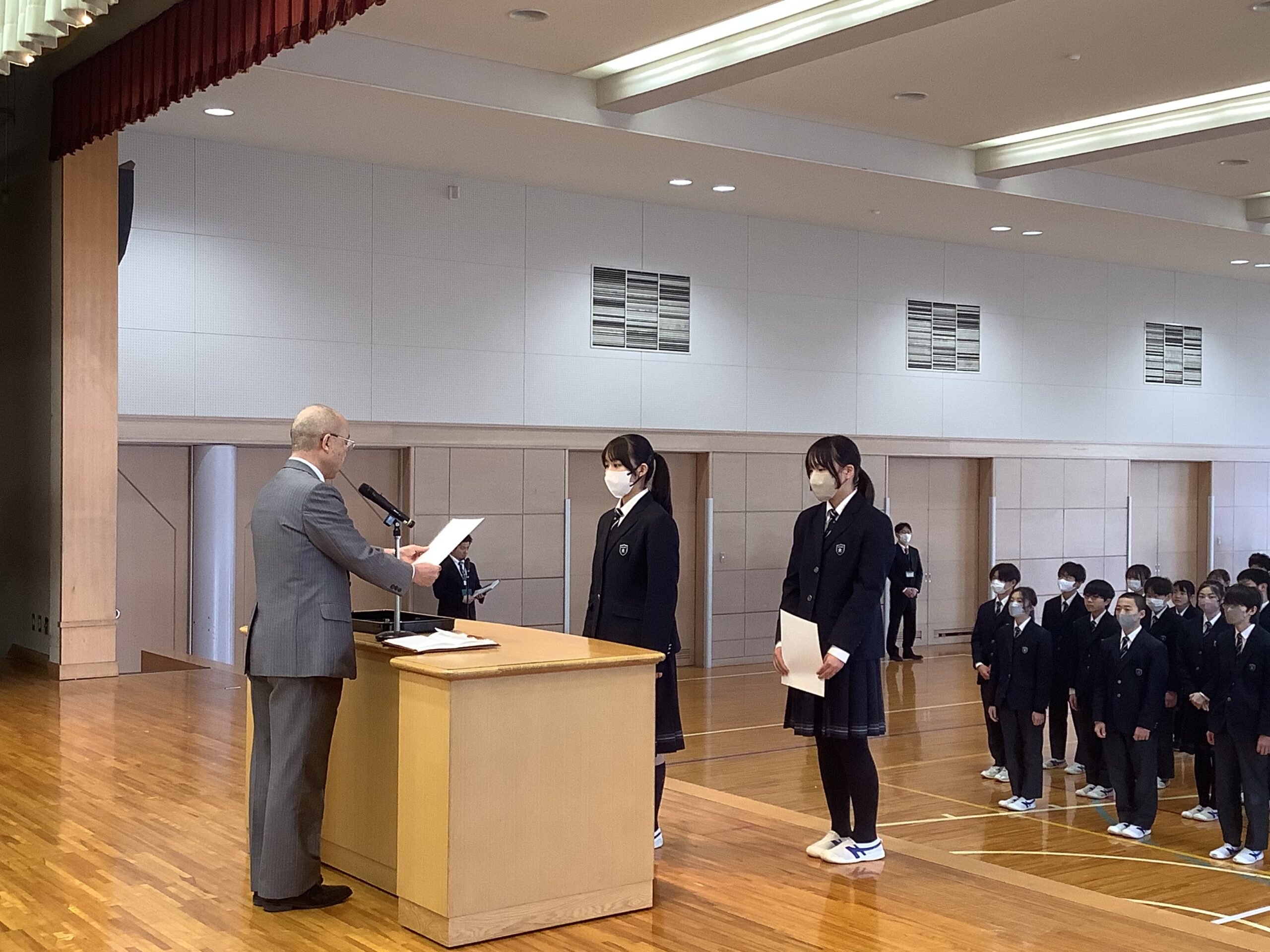 賞状伝達では、ぼくらの広場やかきぞめ展などの国語の授業での受賞や、ソフトテニス部、剣道部などの大会での活躍を全校生徒でお祝いしました。