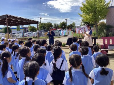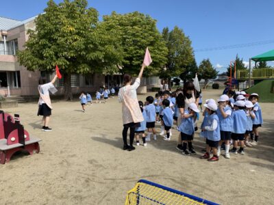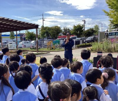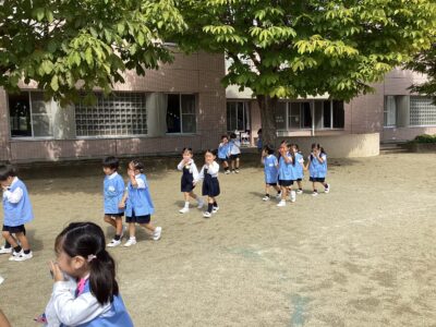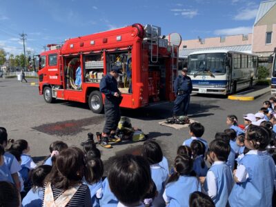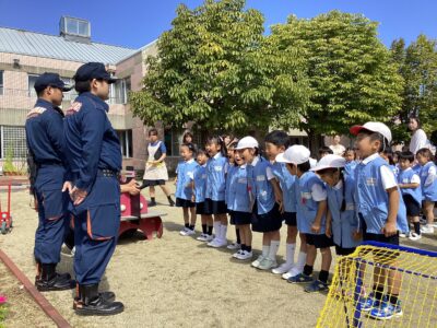 今回は、消防士さんが見守る中での実施でした。子どもたちは話をよく聞き、落ち着いて行動することができました。満3歳児クラスさんやたまごクラブさんの子どもたちも、涙を見せることなく真剣に取り組む姿がありました。年中・年長児さんは、過去の経験を活かし、年少さんの手を引いて、スムーズに避難場所まで移動することができました。