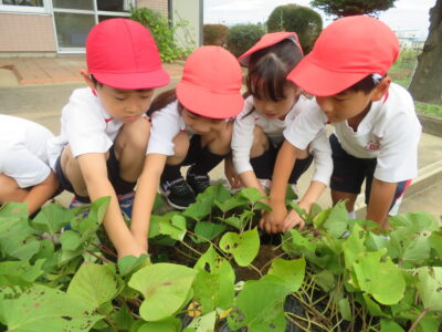 年中・年少児の子どもたちの応援を受け、年長児がさつまいもを堀りました。