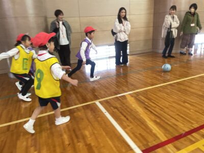 お友達や先生にボールをタッチしてみたり、足の周りでボールを回したり、バランスを取ったり・・・
