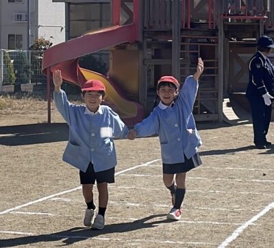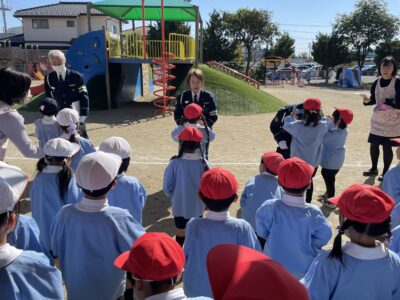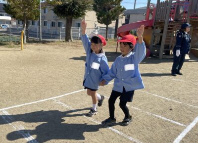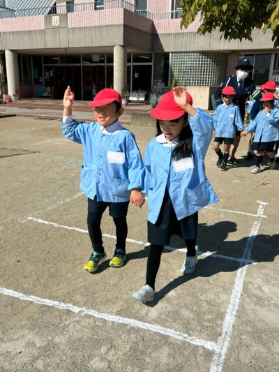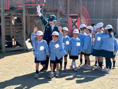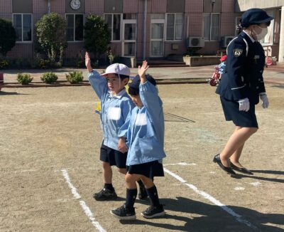 後半は、年長児が『トントンとまれ』の魔法の言葉を実践し、園庭で信号や横断歩道の渡り方を楽しく学びました。