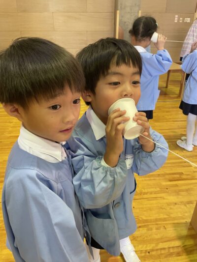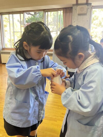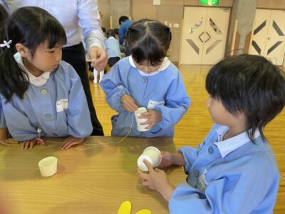 作り方を教えてもらいながら、紙コップと凧糸を使って電話を作る子どもたち。