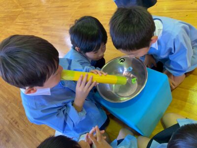声の振動でモールが動いたことを教えてもらうと、今度は子どもたちが声を出して動くのか実験です!