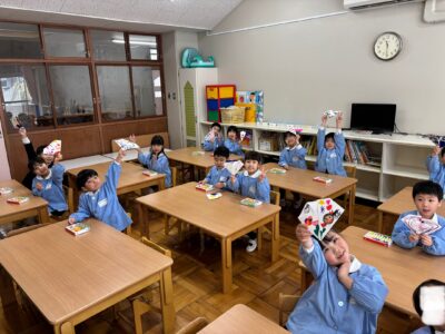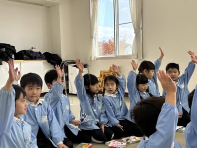紙芝居で17の目標について、分かりやすく教えてもらい、その後は、3択の質問に答えていき、より理解を深めることが出来ました。「水を出しっぱなしにしない」「食べ物を残さない」「ごみはゴミ箱に捨てましょう」「使わない電気は消しましょう」それは、すべて温暖化防止につながること。そんな話を聞いた後、クラスに戻ると食前に手を洗う時に「水を出しっぱなしにしちゃだめなんだよね。」と、早速実践している姿もありました。