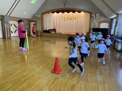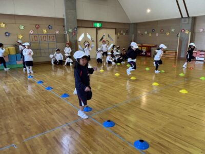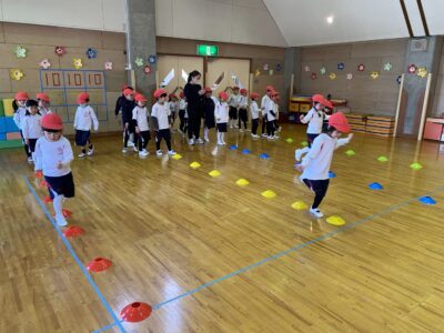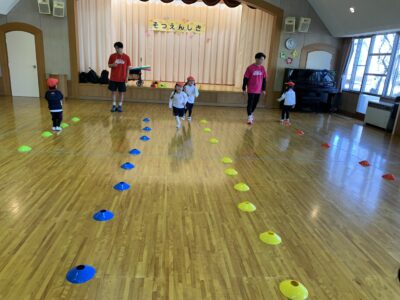 青いコーンが上がったらジャンプ、黄色は床タッチ、赤はピタッと止まるというルールで、子どもたちはコーンの色をよく見ながら楽しそうに体を動かしていました♪